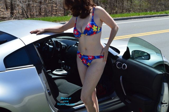We were traveling by car and needed to stop and stretch our legs. Thought it would be nice for a photo opportunity to share with all you Voyeur Web fans. I put on my little bikini and here's how the pics came out. My husband was getting excited seeing me naked so we ended up taking a longer break then we originally thought. LOL